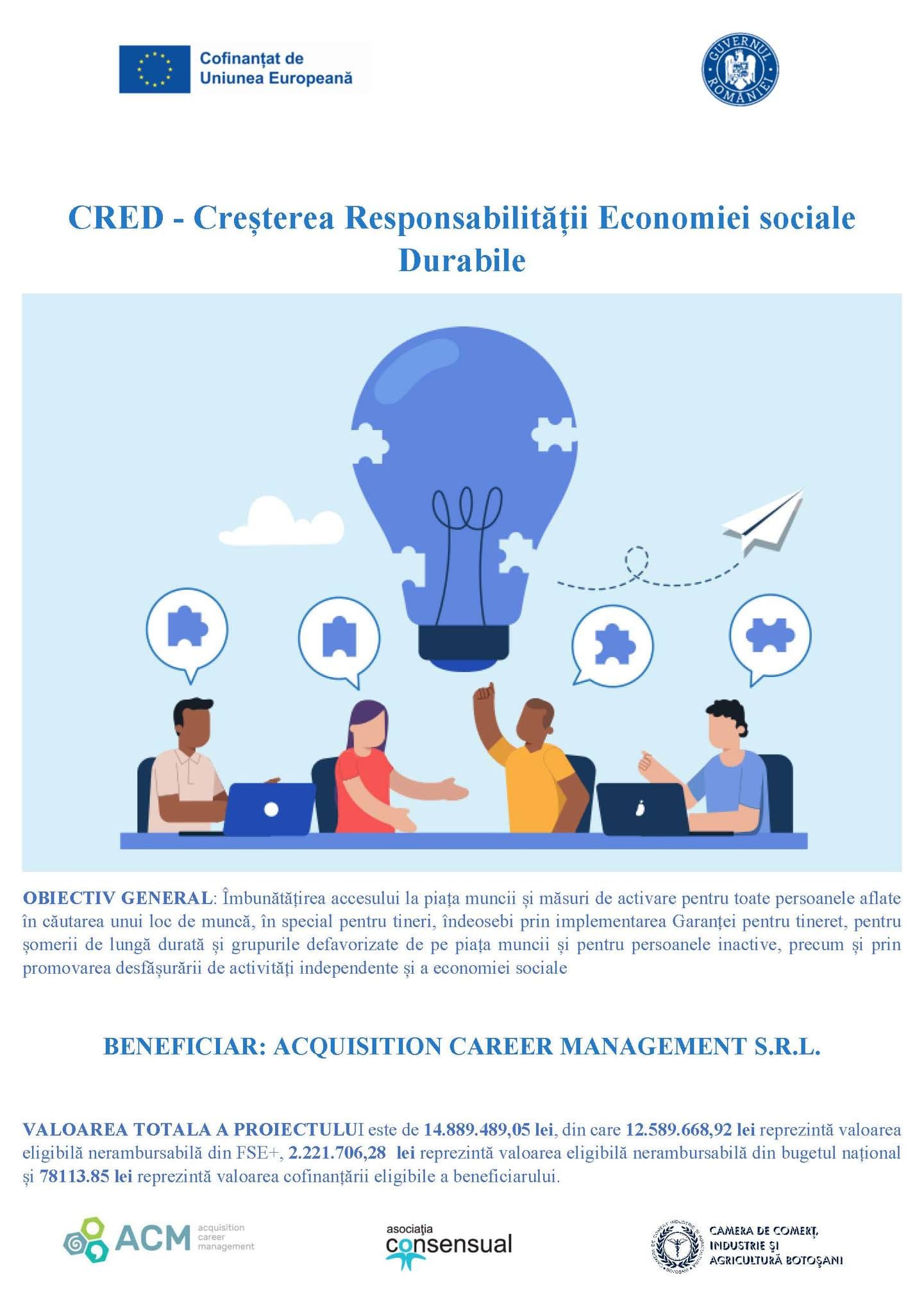 Proiectul are ca obiectiv general facilitarea accesului la un loc de muncă sau păstrarea acestuia pentru 305 persoane fără sau cu nivel scăzut de calificare, cu vârste între 18 și 64 de ani, din județul Botoșani.