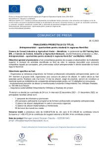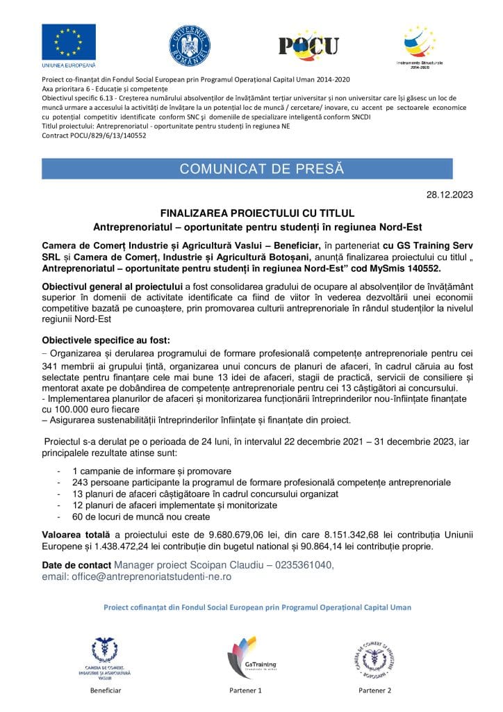 Camera de Comerț Industrie și Agricultură Vaslui – Beneficiar, în parteneriat cu GS Training Serv SRL și Camera de Comerț, Industrie și Agricultură Botoșani, anunță finalizarea proiectului cu titlul „ Antreprenoriatul – oportunitate pentru studenți în regiunea Nord-Est” cod MySmis 140552.